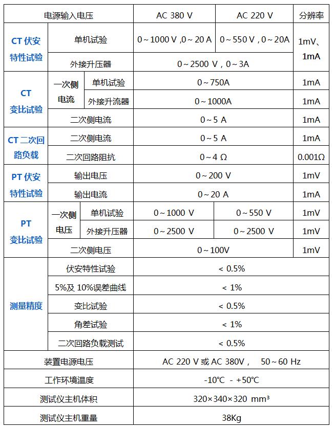 裝置可用于CT、PT的伏安特性曲線、10%和5%誤差曲線、變比、極性、角差測(cè)量、二次側(cè)回路負(fù)載測(cè)試、二次側(cè)回路檢查、退磁功能、二次繞組交流耐壓等試驗(yàn)。