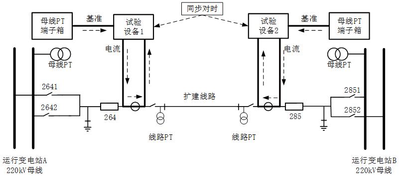 線路改擴(kuò)建通常為兩側(cè)線路同時進(jìn)行,傳統(tǒng)方法通常為本側(cè)保護(hù)裝置自環(huán),單側(cè)加量進(jìn)行后備保護(hù)向量驗證,難以進(jìn)行差動保護(hù)向量驗證。國網(wǎng)公司 Q/GDW 12690-2025 《負(fù)荷模擬式繼電保護(hù)向量檢查試驗導(dǎo)則》明確提出了 AB 站線路差動保護(hù)向量檢查方法。兩站均以系統(tǒng)電源為基準(zhǔn)(或采取對時同步),分別用試驗設(shè)備模擬一次負(fù)荷電流流經(jīng)電流互感器,檢查線路差動保護(hù)向量是否正確。