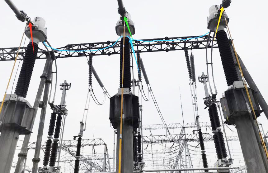 由于兩站都采用 AIS 架空接線,變電站側(cè)試驗使用一臺三相電流源在 2212 間隔 CT 進(jìn)行一次升流,將試驗設(shè)備三相輸出線分別夾在三相電流互感器 P1 位置注流,過電流互感器之后使用一次三相短接線短接接入至通流設(shè)備的 N 實現(xiàn)回流(若條件允許可通過地刀回流),盡可能減少通流路徑范圍從而規(guī)避對運行系統(tǒng)的影響。風(fēng)電場側(cè)試驗使用一臺三相電流源在 2211 間隔 CT 進(jìn)行一次升流,直接將試驗儀器三相輸出線分別夾在三相電流互感器 P1 位置注流,過電流互感器后使用一次三相短接線短接接入至通流設(shè)備的 N 實現(xiàn)回流,盡可能減少通流路徑范圍以規(guī)避對運行系統(tǒng)的影響。