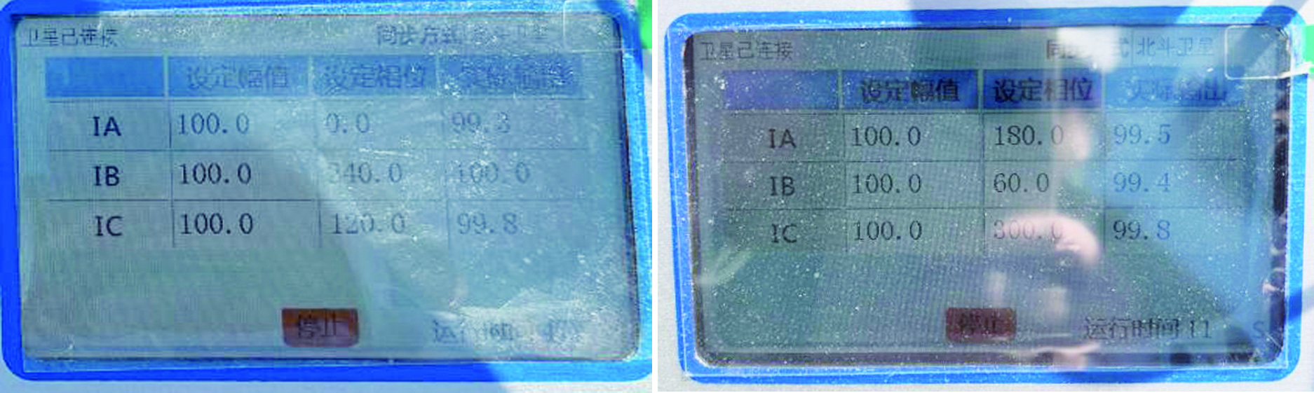 試驗設(shè)備開機(jī)后,選擇 GPS 對時方式,兩站之間可通過 GPS 同步對時。對上時后按照變電站側(cè)電流源一次施加電流 A 相 100A ∠ 0 °, B 相 100A ∠ 240 °, C 相 100A ∠ 120 °,風(fēng)電場側(cè)電流源一次施加電流 A 相 100A ∠ 180 °, B 相 100A ∠ 60 °, C 相 100A ∠ 300 °分別輸出,通過 秒脈沖同步觸發(fā),保證過零時刻兩邊電流輸出相位同步。 在保護(hù)裝置 查看采樣和差流,完成線路差動保護(hù)向量校核試驗。