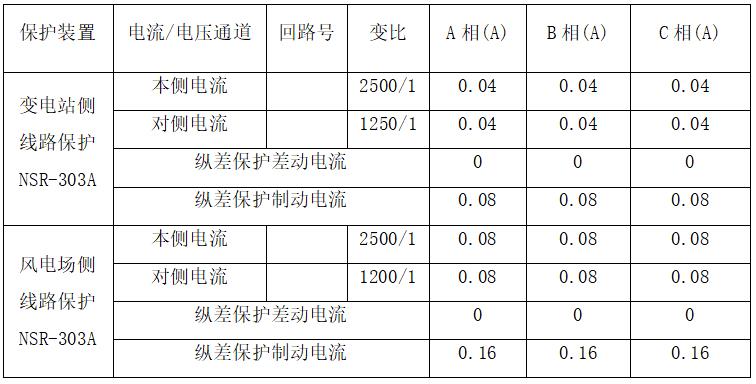 變電站側(cè)實際通流方向為母線流向線路,風(fēng)電場側(cè)實際通流方向也為母線流向線路,保護(hù)裝置顯示電流均為折算后電流,差動電流為 0 ,說明線路差動保護(hù)向量正確。