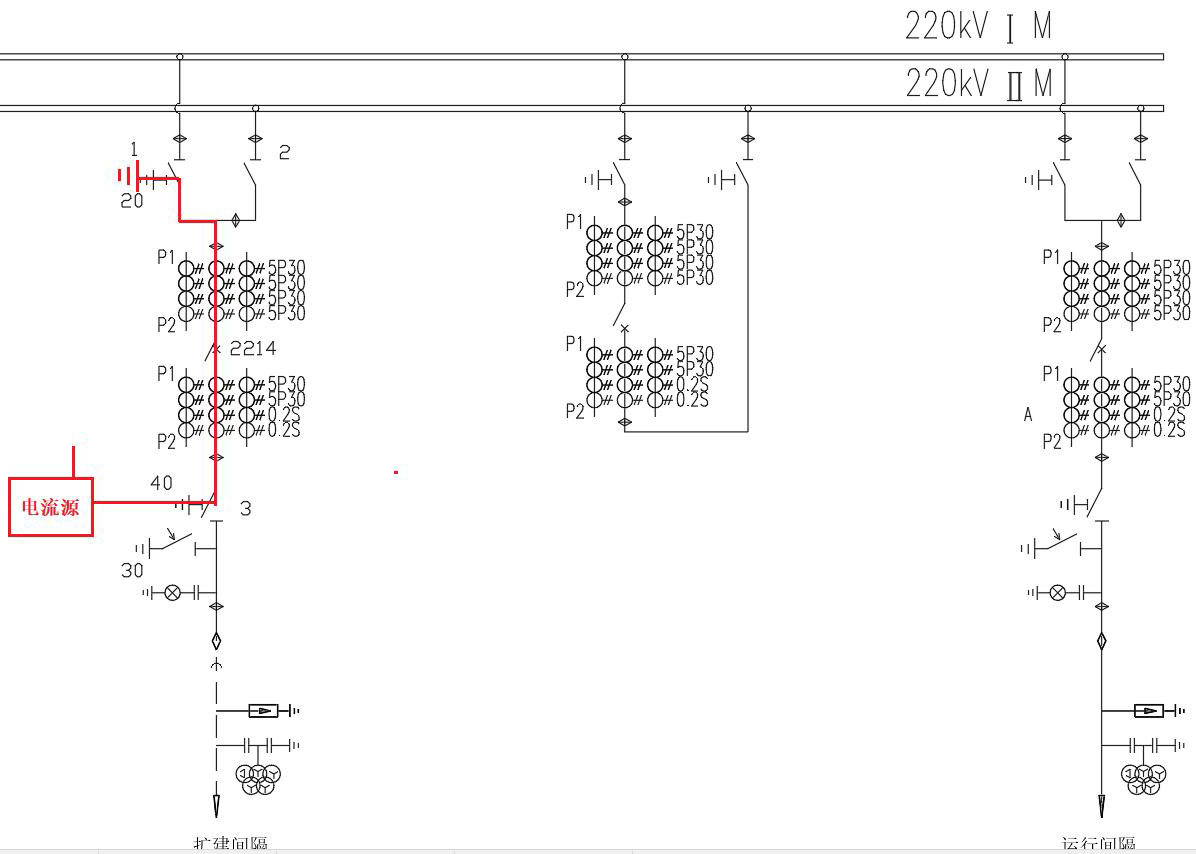 由于母線運行,此處不能用多間隔串行通流方式,只能單間隔通流。電流源 ABC三相從擴建線路221440地刀注流,(過CT)經(jīng)2214開關(guān)、221420地刀入地,電流源N相接地形成電流回路。電流源同時采用母線電壓互感器端子箱運行系統(tǒng)電壓A相(可采用計量PTA相繞組)為基準,同步輸出三相一次電流(此一次電流應(yīng)參考短接基準支路的大小和潮流方向),在線路保護裝置、接入輪停母線保護查看采樣幅值、相位及差流,以此來判斷線路后備保護及接入母差保護向量是否正確。