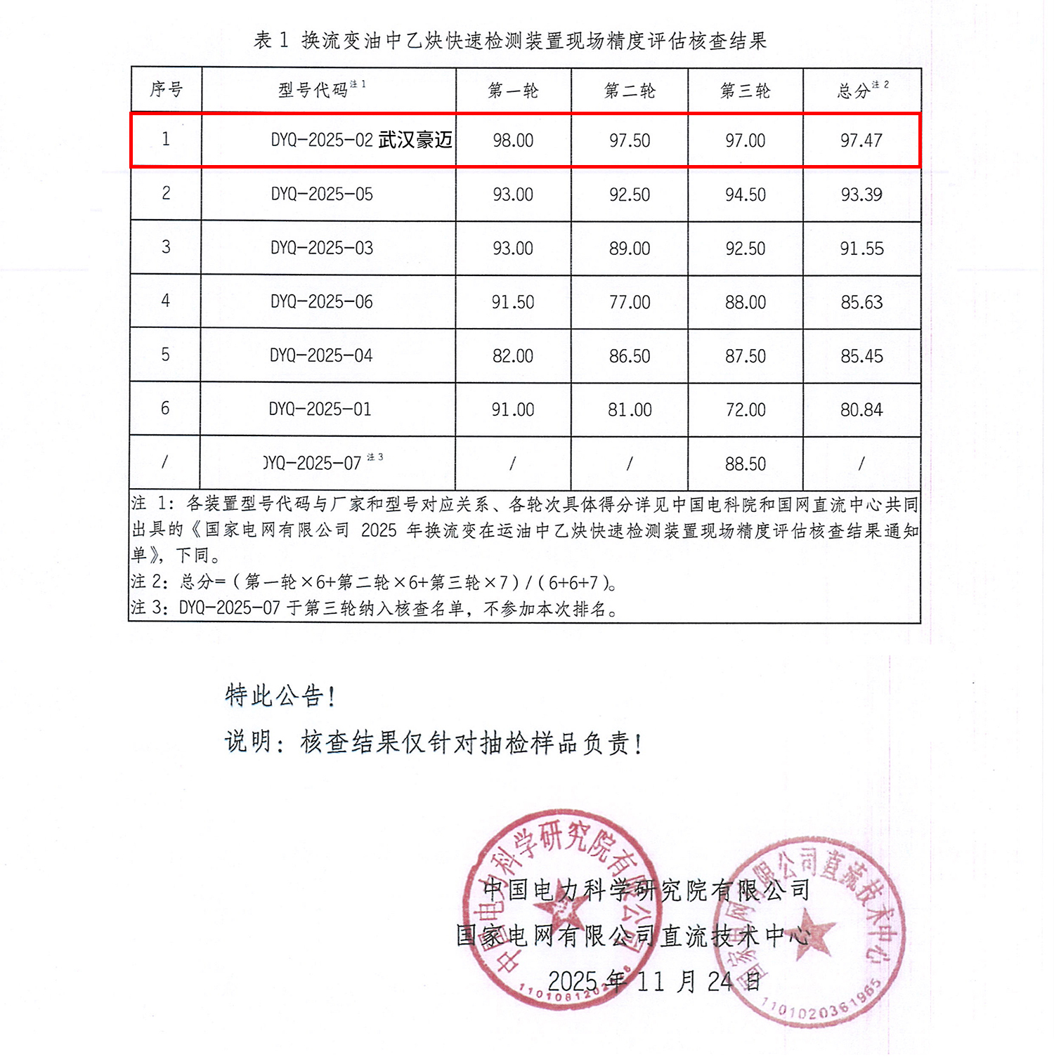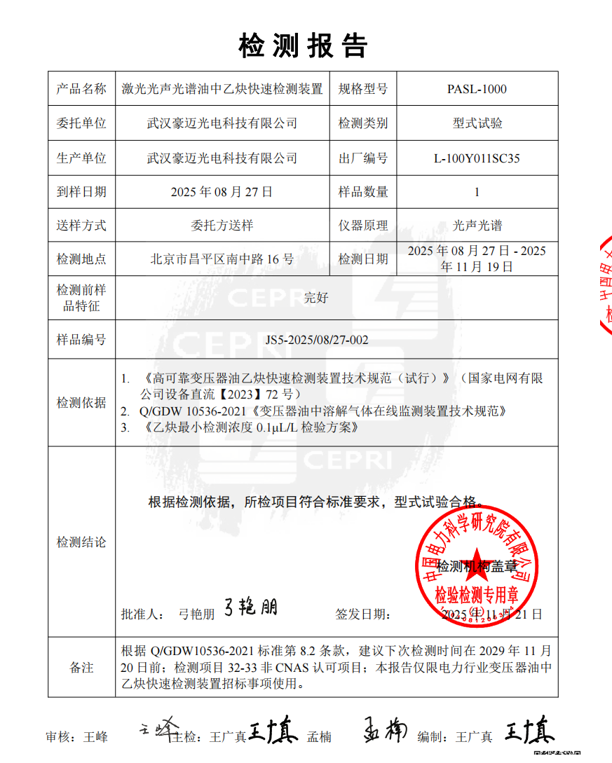 2025年12月23日,由中國電科院、國網直流中心共同承擔的2025年度換流變在運油中乙炔快速檢測裝置現場精度評估結果正式公布。武漢豪邁光電科技有限公司自主研發(fā)生產的PASL-1000激光光聲光譜油中乙炔快速檢測裝置在測量精度、響應速度、抗干擾能力等核心指標上表現搶眼,三輪評估核查均以絕對優(yōu)勢位列榜首,最終榮獲總分第一的優(yōu)異成績。該裝置將乙炔最低檢測限值下探到0.05μL/L,為變壓器故障預警樹立了新的技術標桿。