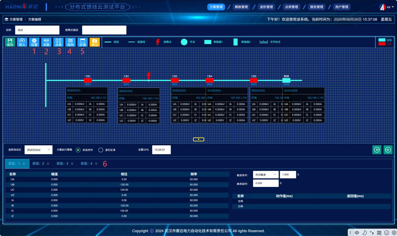 通過模擬開關盒與測試軟件協(xié)同配合, 實現(xiàn)對 數(shù)字式終端 FA 故障邏輯驗證。測試 項目 包括:故障信號自動識別與上報 、 保護動作邏輯判斷與執(zhí)行 、 與上級系統(tǒng)聯(lián)調 及 信息上傳 。 系統(tǒng)完整演示從故障發(fā)生到隔離、再到供電恢復的全過程,驗證 FA 策略可行性與平臺處理實時性。