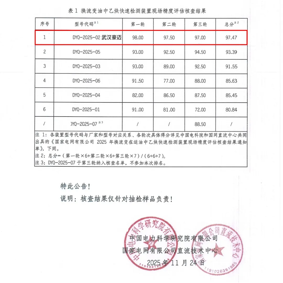 2025年度換流變在運油中乙炔快速檢測裝置現場精度評估榮獲總分第一